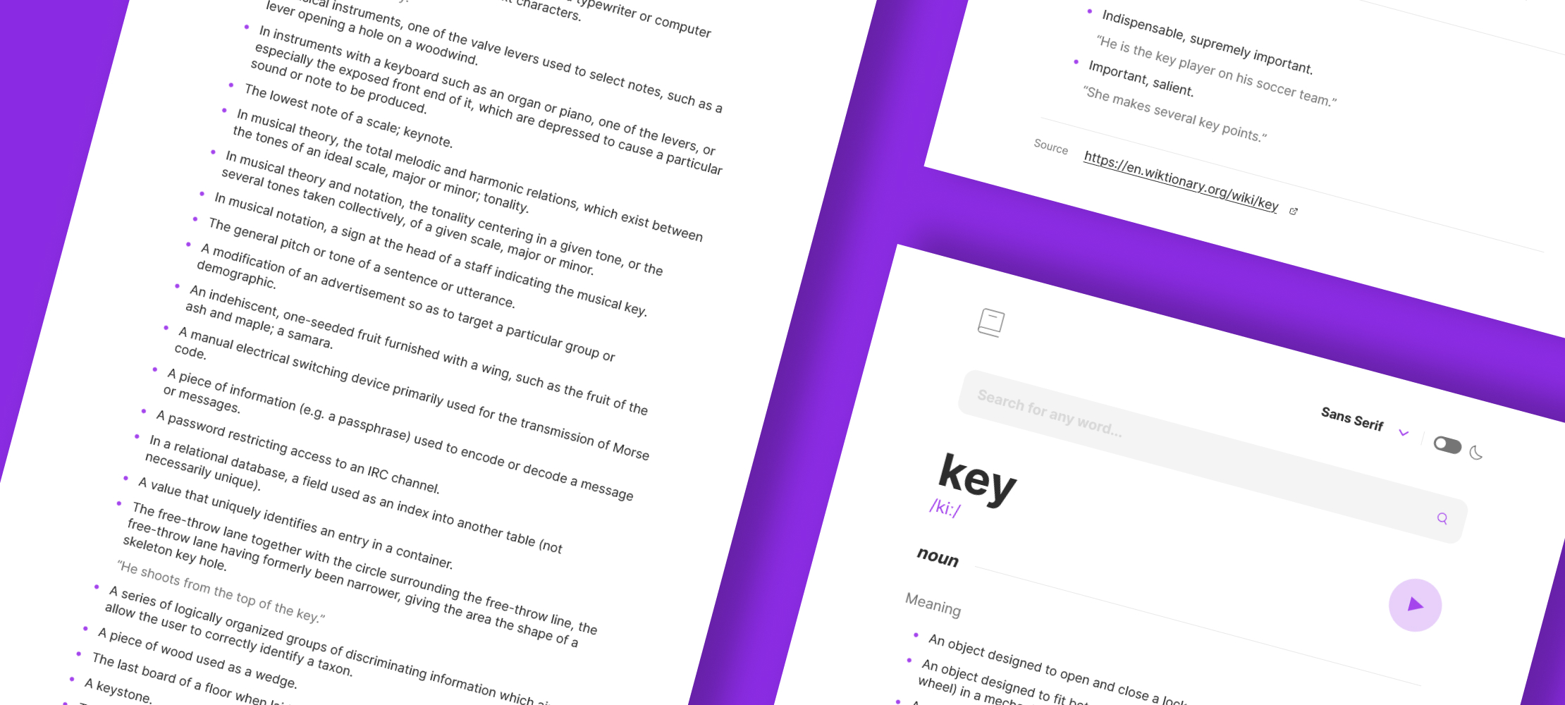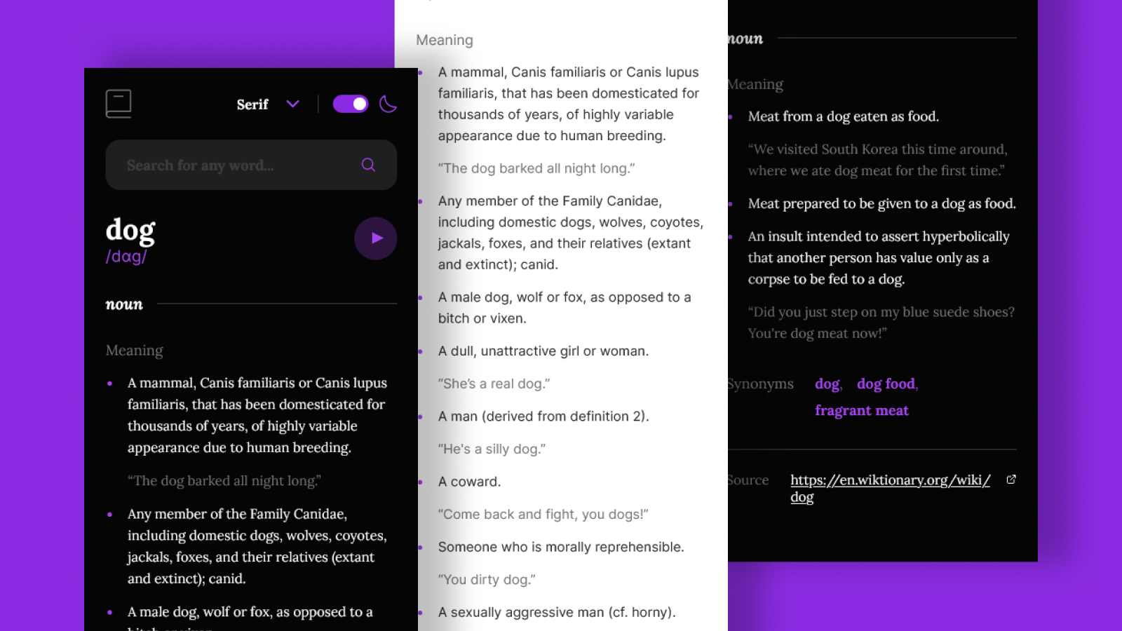 In this project I used React and Vite to build the interface, CSS custom properties for theming and typography, and integrated the Free Dictionary API for word lookups, including audio playback when available.